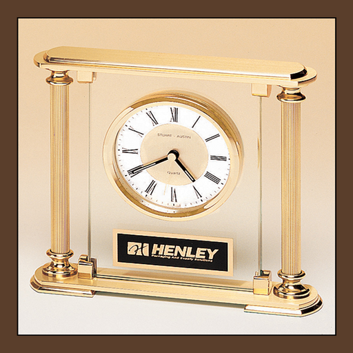 Product Description: This upright glass clock with goldtone columns features a diamond-spun dial and three-hand movement. Clock batteries includ...